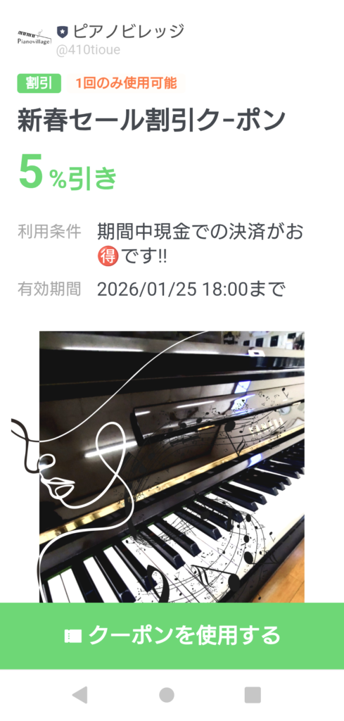 ヤマハ・カワイピアノ 2026^新春セール開催中! 期間:2026年1月3日(土)~2026年1月25日(日) 特典:公式ライン登録にて割引クーポンプレゼント!! 👇 […]
